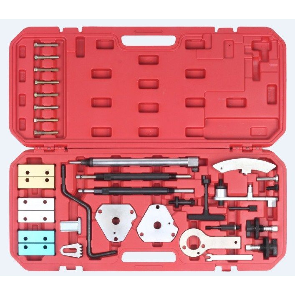 Комплектация: Фиксатор маховика Фиксатор коленчатого вала Кондуктор распредвалов Фиксатор вала топливного насоса (ТНВД) Съемник шкива коленчатого вала Натяжитель зубчатого ремня Применение набора специнструмента: Бензиновые двигателя: 1.