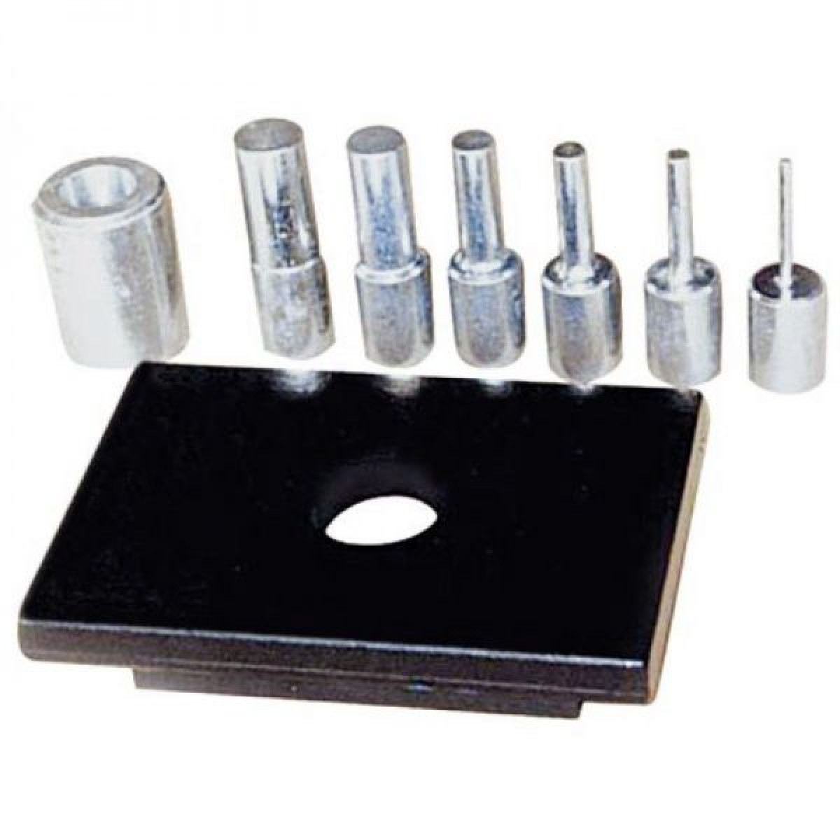 Комплект состоит из 6-ти из пуансонов различного размера (от 5 мм до 29 мм) можно применять с металлами различной толщины.