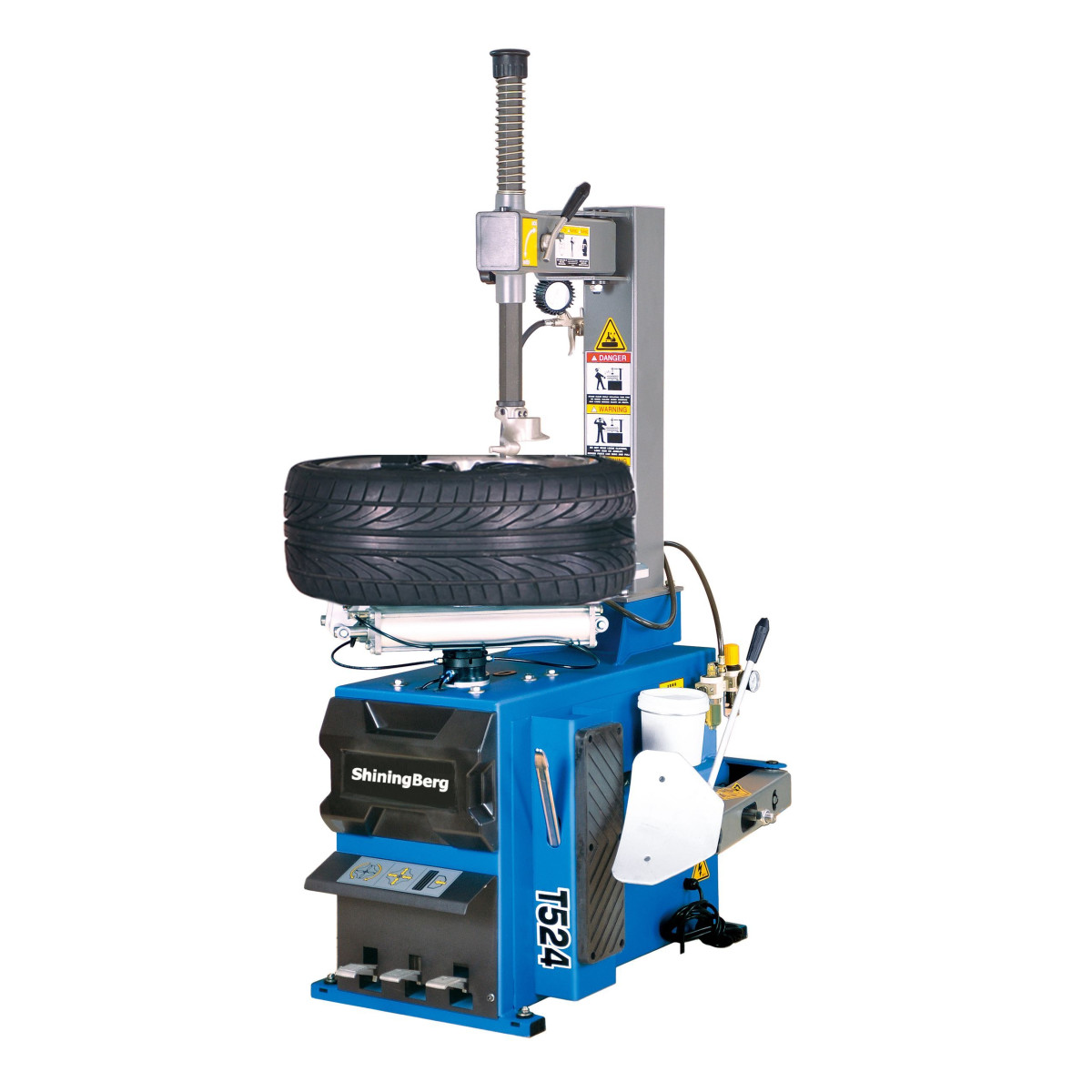 Станок шиномонтажный ShiningBerg T524, п/автомат, 220 V В комплектацию станка входит: - iиномонтажный стенд с отклоняемой в бок консолью монтажной стойки с пластиковыми накладками – монтажная лопатка; – устройство для отрыва борта шины; – полка для размещения аксессуаров в основании монтажной стойки; – влагомасло отделитель (фильтр-лубрикатор) – пистолет для накачки шин с манометром; – емкость для смазки.