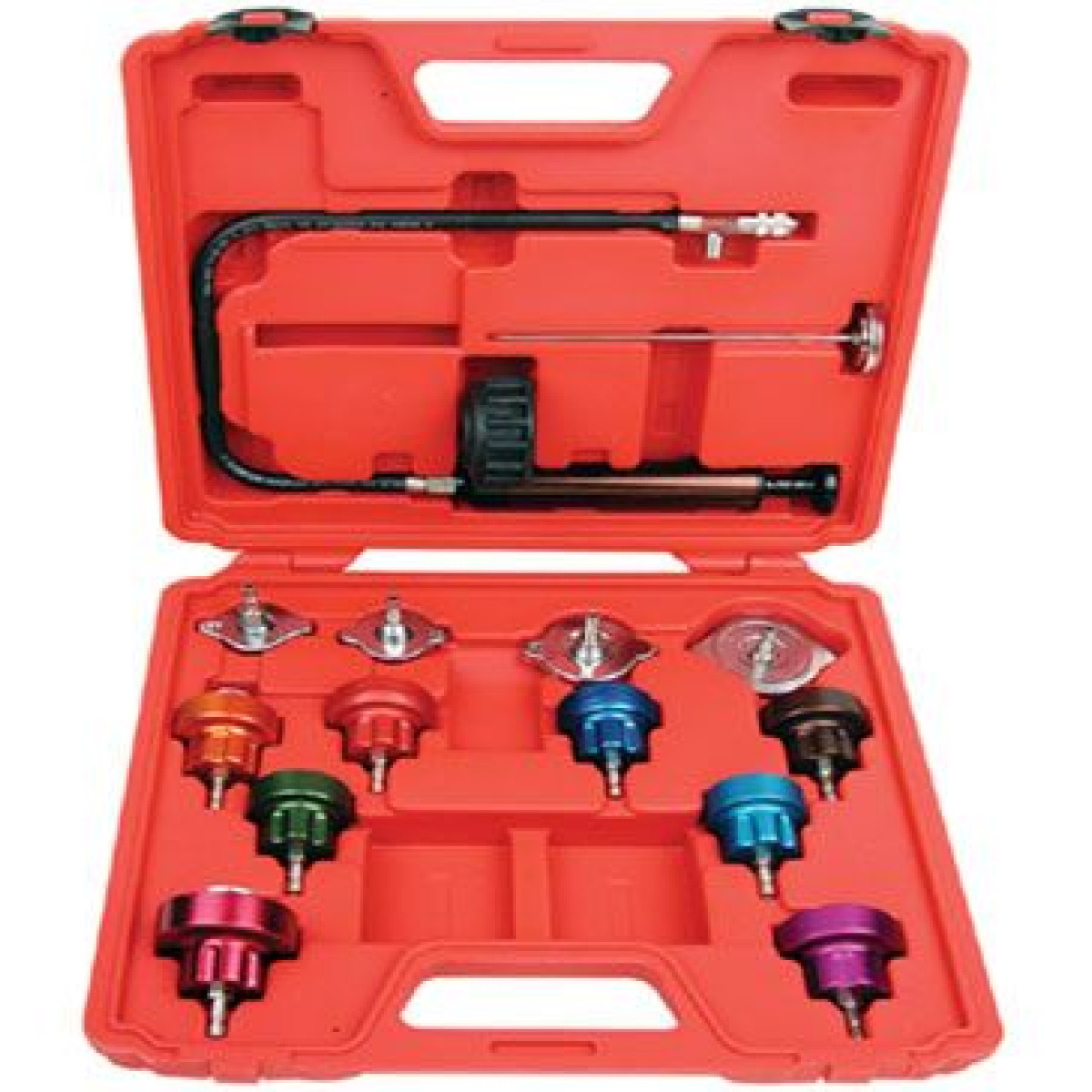 Тестер герметичности системы охлаждения AmPro • Ручной насос • Термометр • В комплекте 12 переходных крышек • Для обслуживания современных и ранних моделей автомобилей